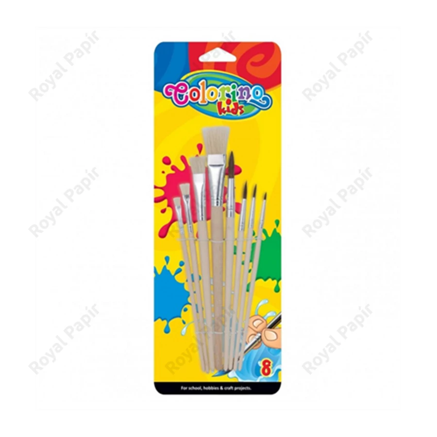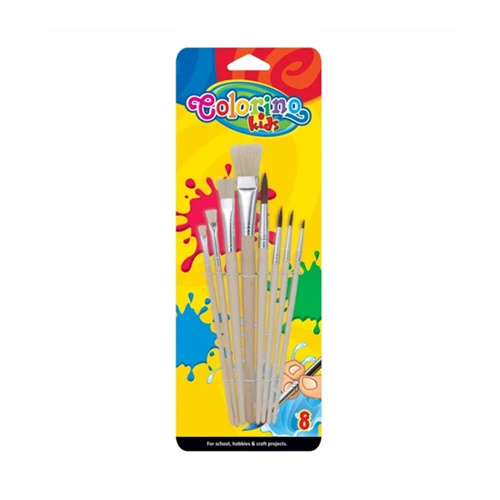 Ecset készlet, 8 db-os, natúr fa, Colorino 8 különböző végű ecset készlet natúr fából. Ecset méretek:1, 2, 3, 6, 10, 12 lapos és 3/4-es lapos. Kiváló minőségű Colorino termék.