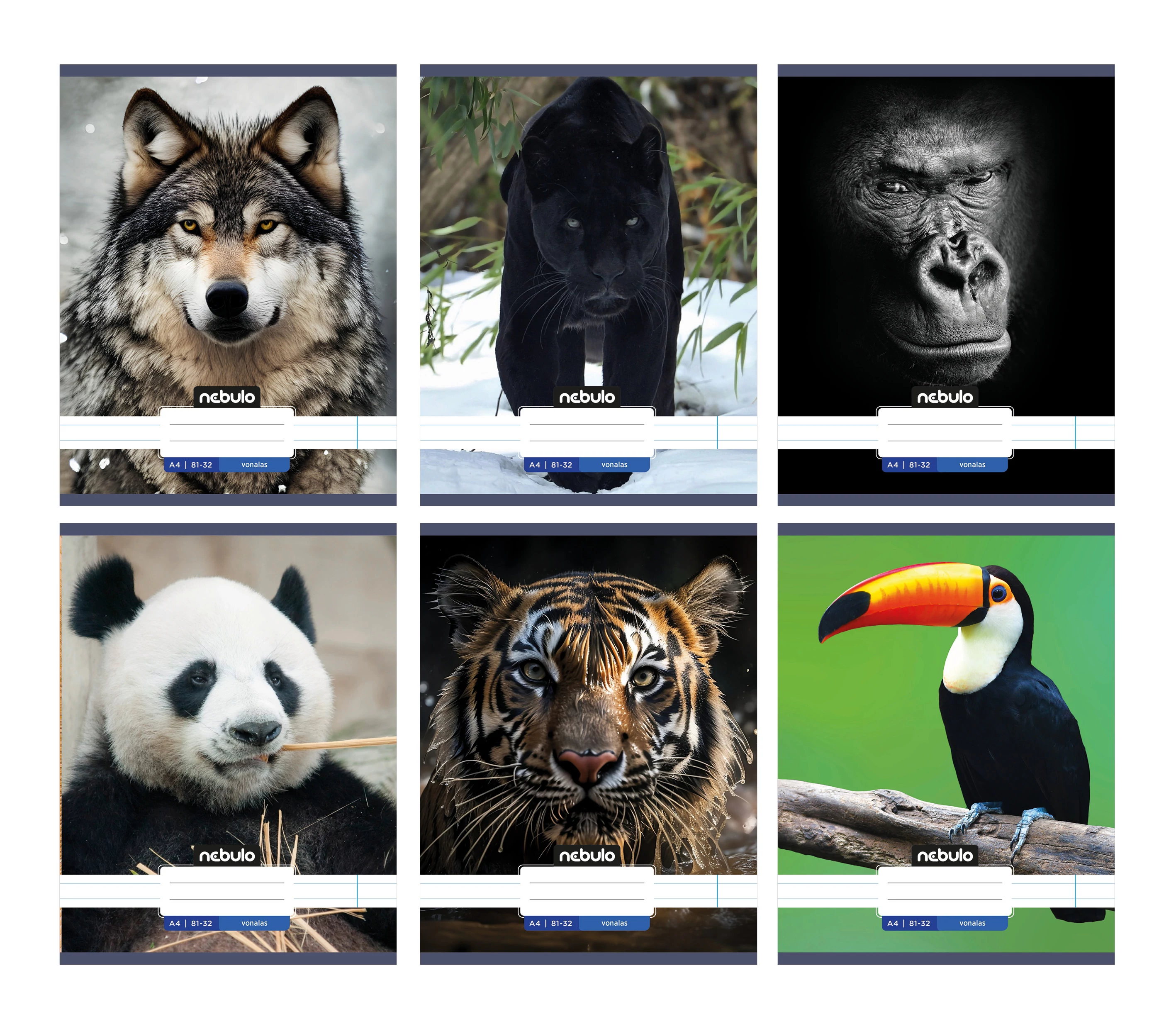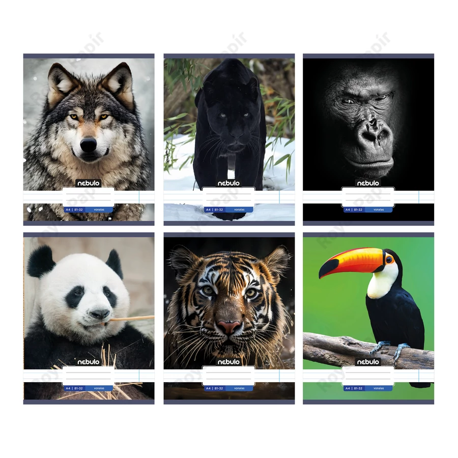 A/4-es tűzött iskolai négyzetrácsos füzet, 32 lapos (87-32). 12 db füzet (6 különböző állatos minta, azaz 2db/minta) van egy csomagban. 70 g-os füzetlapok és 200 g-os műnyomó borító fényes fóliával.