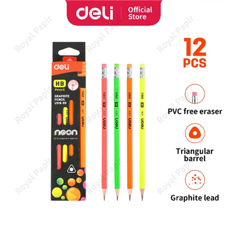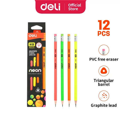 Grafitceruza radírral, HB, háromszögletű, DELI "neon", vegyes szín