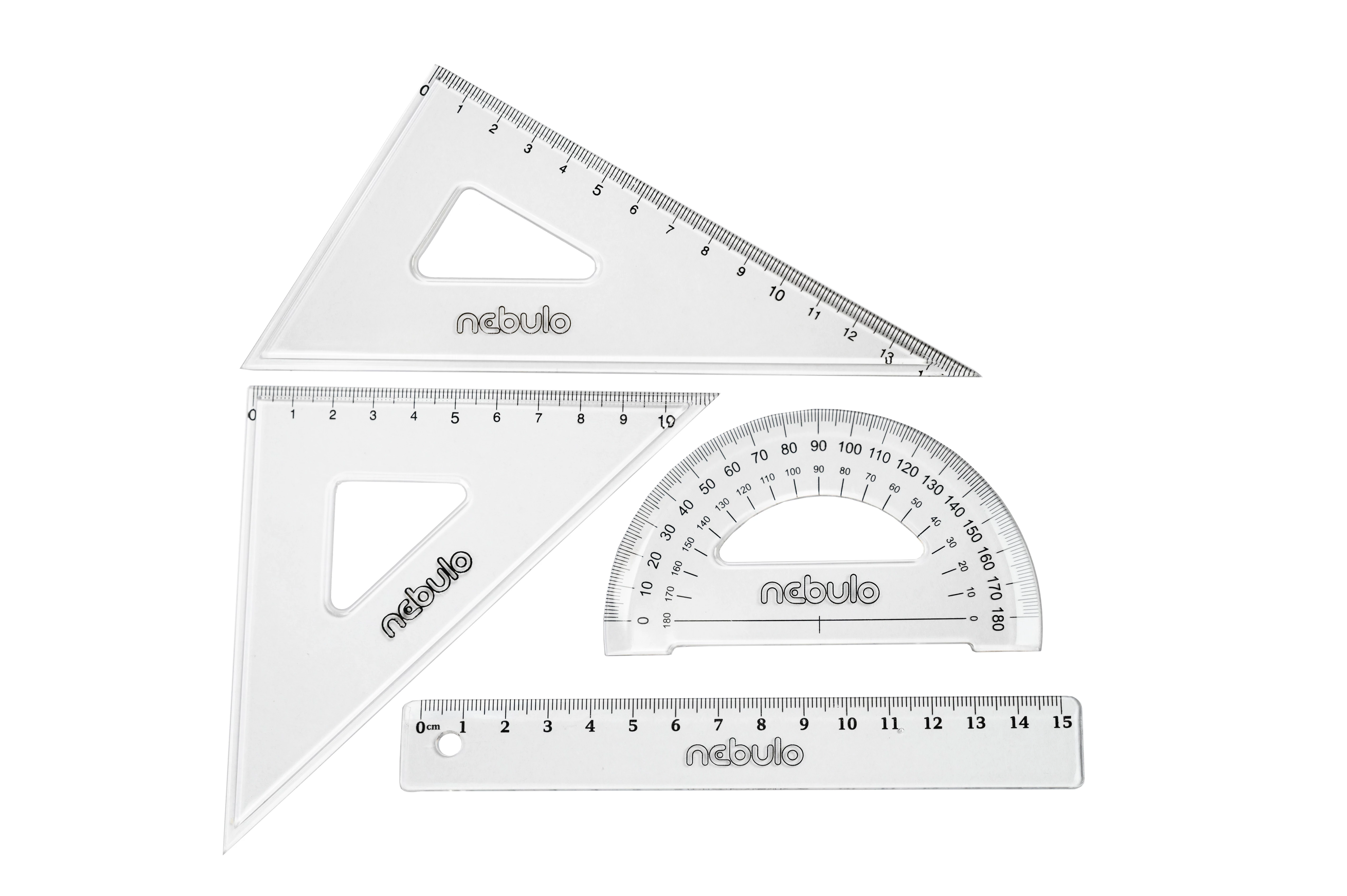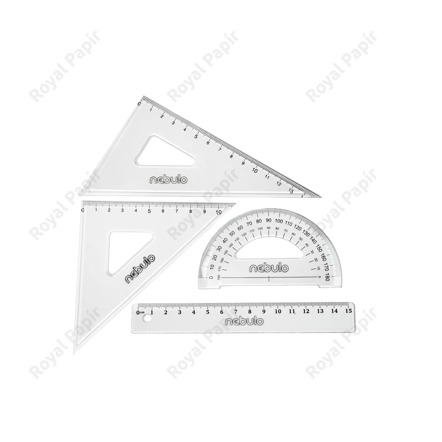 Iskolai vonalzókészlet jól olvasható számskálával. A készlet tartalma: 1 db 15 cm-es egyenes vonalzó; 1 db 60°-os, 15 cm-es számskálájú háromszög vonalzó; 1 db 45°-os, 11 cm-es számskálájú egyenlő szárú háromszög vonalzó; 1 db szögmérő.