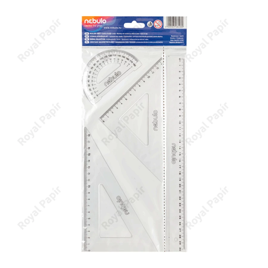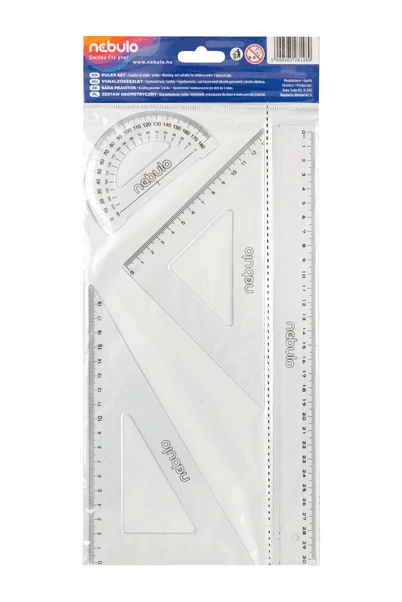 Iskolai vonalzókészlet jól olvasható számskálával. A készlet tartalma: 1 db 30 cm-es egyenes vonalzó; 1 db 60°-os, 18 cm-es számskálájú háromszög vonalzó; 1 db 45°-os, 13 cm-es számskálájú egyenlő szárú háromszög vonalzó; 1 db szögmérő.